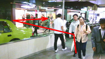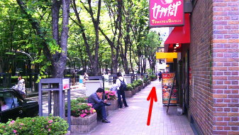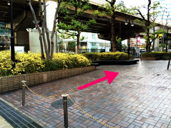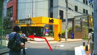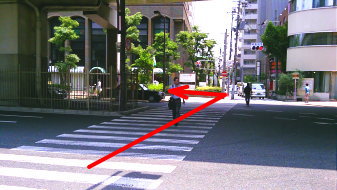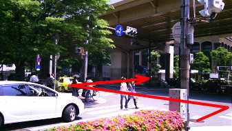 4.左側にあるガラスの壁が終わった所にある横断歩道を渡り右へ曲がります。