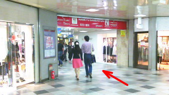 1.阪急電車梅田駅改札口を出て階段またはエスカレーターを下り右へ進みます。