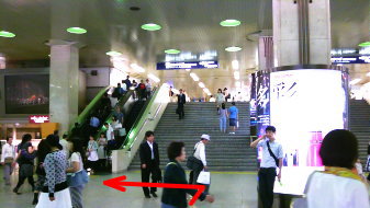 13.左前方に見えてくる阪急線梅田駅に向かうエスカレーターに乗り、上に上がります。
