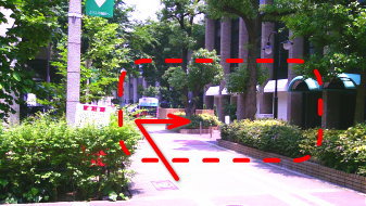 17.左側にあるガラスの壁が終わった所にある横断歩道を渡り右へ曲がります。
